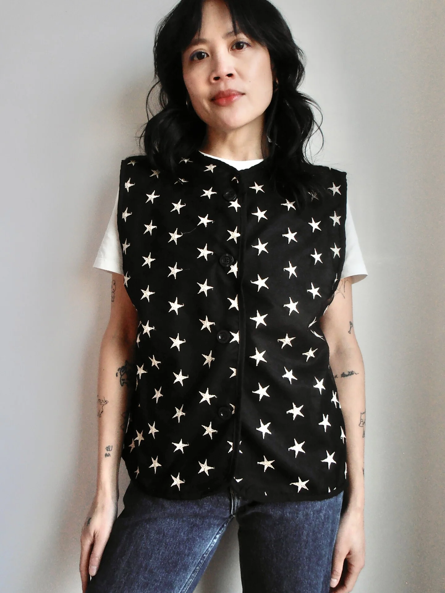 Black button-up vest with star pattern. Black mesh overlay with embroidered silver stars, lined. Vest is cut from deadstock polyester fabric.